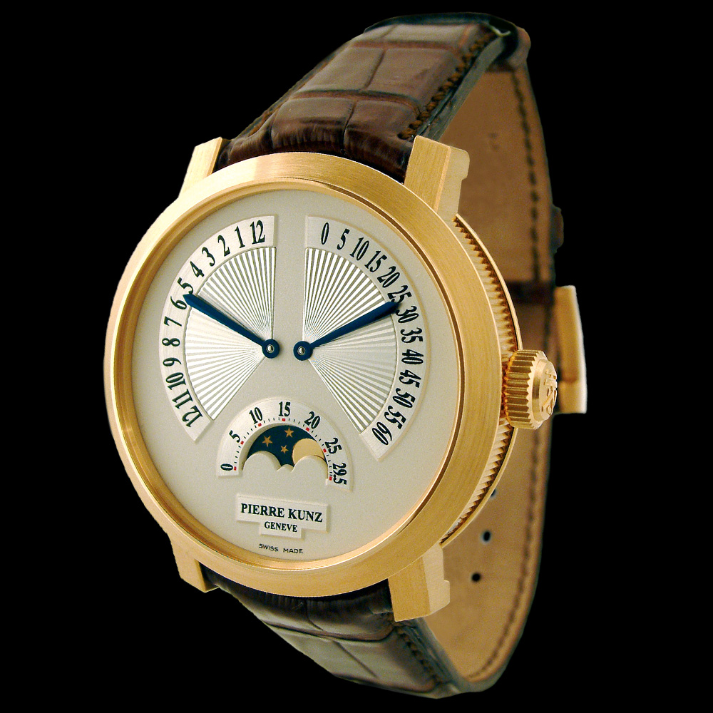“時”にまつわるあらゆる時計の機能を“レトログラード”で表現する研究を重ねたピエール クンツは、それらを克服するばかりでなく、それぞれが異なった役割の機構を一つの時計の中に複合化したモデルの開発に成功しました。